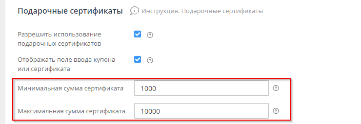 Активировать или отключить возможность использования подарочных сертификатов в заказах, а также указать минимальную и максимальную сумму сертификатов, можно в разделе "Настройки" - "Заказы" - вкладка "Общие", в блоке настроек "Подарочные сертификаты".