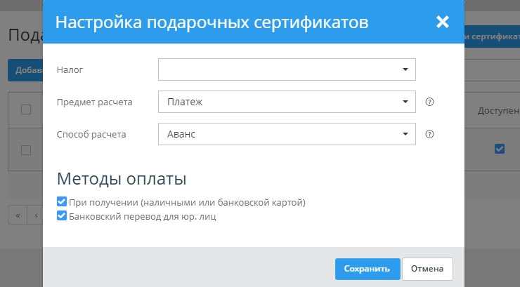Настройка методов оплаты подарочного сертификата