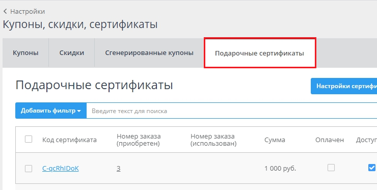 А сам сертификат отобразится в разделе "Настройки" - "Купоны, скидки, сертификаты", вкладка "Подарочные сертификаты" (рис. 9).