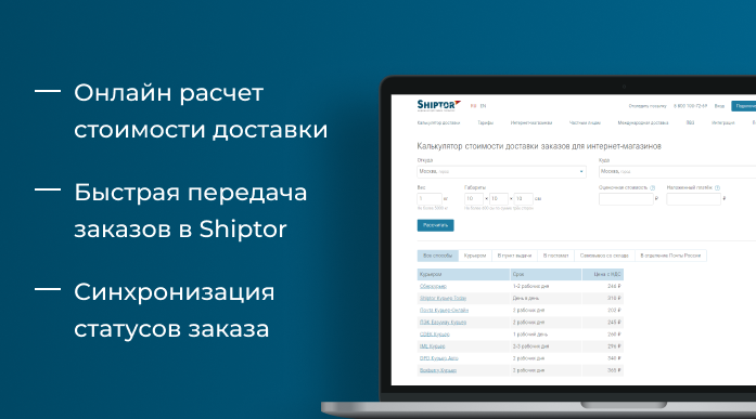 Shiptor – универсальный агрегатор доставки для интернет-магазинов. Компания действует как полноценный логистический и транспортный партнер. Вся организация работы с заказами ложится на плечи Shiptor: обработка и упаковка на складе, логистика, приём платежей.